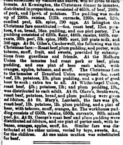 The huge amounts of food donated to the poor were news-worthy, and the size of London’s workhouses demanded Guinness-world-record-size quantities of ingredients. On 1 Jan 1876, readers of the Norfolk News could be wowed by reports from London workhouses, such as the 1540lb. of beef distributed in St Pancras, where ‘the male inmates must be terrible smokers, and the women snuff-takers, for tobacco figures at 48lb. and snuff at 20lb’, and the ingredients of Marylebone’s plum pudding: 400 lb. flour, 300 lb. suet, 400 lb. currants and raisins, 150lb. sugar, 700 eggs, 10 gallons of ale, 10 lb. ginger and other spices, and 40 lb. candied peel! Norfolk News readers could also enjoy reports on Christmas dinners at workhouses in their own county, such as at Norwich, Lingwood, St Faith’s, and Swaffham โ where the inmates not only enjoyed their ‘usual’ Christmas fare, but were also gifted two dozen rabbits from the Marquis of Townsham. You can read a selection of clippings on these festive meals below.