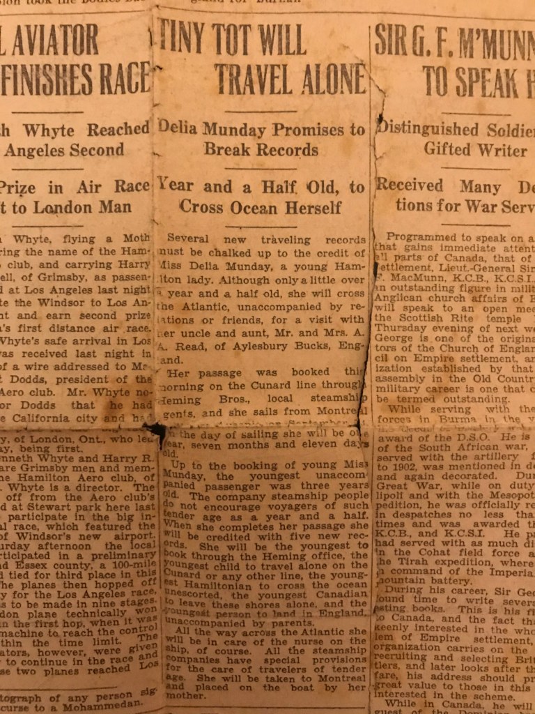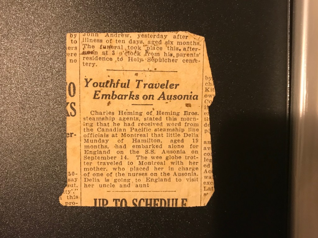 We have several fragile newspaper clippings about this extraordinary event that must have been cut out by Annie. According to the articles, ‘Little Delia Munday’, ‘a young Hamilton lady’, was going to Aylesbury, Bucks, England to visit her aunt and uncle, Mr. & Mrs. A. Read. However, since her parents weren’t mentioned, and it was unprecedented for such a ‘tiny tot [to] travel alone’ to visit relations, I’m sure many people would have read between the lines, and guessed that she was an illegitimate child going to live with family in England. According to the articles in The Hamilton Spectator and Toronto Daily Star, Delia’s trip, ‘unaccompanied by relations or friends’, would break five records, as she would be ‘the youngest to book through the Heming Bros. [local steamship agent] office, the youngest to travel alone on the Cunard or any other line, the youngest Hamiltonian to cross the ocean unescorted, the youngest Canadian to leave these shores alone, and the youngest person to land in England unaccompanied by parents.’ The previous youngest unaccompanied traveller had been three, and the ‘company steamship people do not encourage voyagers of such tender age as a year and a half.’