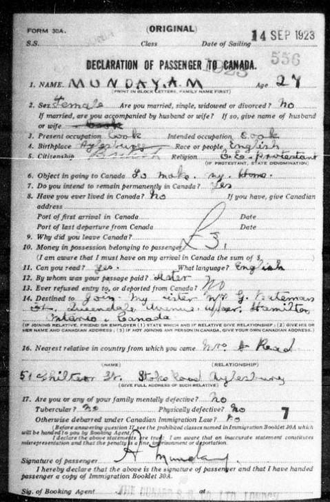 Perhaps it was because the family was so large that some of Annie’s brothers and sisters moved far away from the area in which the Munday family had lived for centuries. Annie’s older brother Alfred went to Edinburgh before WW1, where he became an orchid specialist at the Royal Botanic Gardens. In 1911, her oldest (full) sister Sarah moved with her husband and two young children to Ontario, Canada. Annie’s oldest brother Will and his wife followed them there in 1913. In 1921, both families lived in Hamilton, Ontario. They must have reported back to family in England that life there was treating them well, because on 14 September 1923, Annie set sail for Canada as well. Her passenger declaration (which has just become available to me) shows that she was a cook, aged 27, and that she intended to remain permanently in Canada. Her objective was ‘to make my home’.