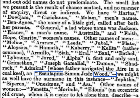 In 1868, various newspapers ran an article called ‘Queer Yorkshire Baptismal Names’! Poor Esculapius, already a family man by then, was included in this public name-shaming.