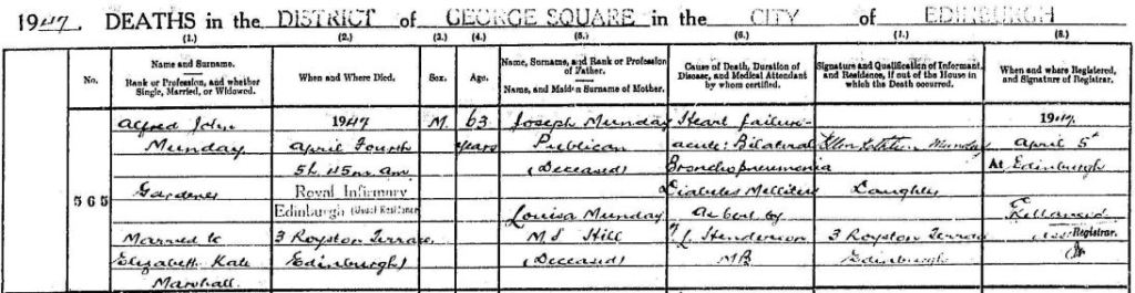 Alfred John Munday died of heart failure on 4 April 1947, at 63 years of age. Researching Alfred has been my first foray into Scottish civil documents, and I must say that I am impressed by the amount of detail included in his death certificate, which includes his wife’s name and maiden name and his parents’ names and occupations. I’m rather jealous of people with Scots ancestry!