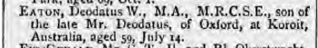 The last Deodatus had no children to carry on the name, and he died intestate, with only £30 14s 2d to his name (in cash, clothing and a few surgical instruments). He was survived by his ex-wife, mother, and several siblings, the last of whom, Charlotte Ellen EATON, a spinster, died in Oxford in 1908. Despite being a divorcé, persistent bankrupt, and emigrant to the other side of the world, the death of ‘EATON, Deodatus W., M.A., M.R.C.S.E., son of the late Mr. Deodatus, of Oxford’ received a brief notice in London’s Pall Mall Gazette.