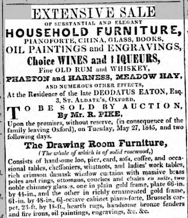 In 1841, the family of 13 lived at 3, St Aldate’s with five servants, and also had an address at Southampton St, Bloomsbury Square, London. However, their comfortable existence came to an abrupt end when Deodatus (3) died in 1845. Sadly, due to a complex inheritance issue, Deodatus’s widow and children were forced to leave their home and the city of Oxford. ‘The solicitor of all parties induced her to leave the house in which [Ann] resided in Oxford, called D. Eaton’s house, and come to London, and from that time to the present, she never received a sixpence from the settled property.’ (Morning Post, 15 Dec 1852).