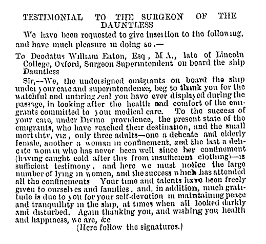 It was a perilous journey for passengers too. Tragically, three women and 17 children died on the voyage. Nevertheless, Dr. EATON, who attended to 17 births (including twins) and solemnised two marriages on board, was presented with a ‘complimentary testimonial’ signed by almost all of the passengers: