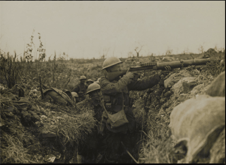 Later in the war, Neville was trained to become a Lewis gunner. A Lewis gun was an early light machine gun. In 1915 each battalion only had 4 such guns, but by 1917 each infantry section had its own gunner and backup, totaling 46 guns per battalion. Each Lewis gun required a team of two gunners: one to fire and one to carry ammunition and reload. All of the members of an infantry platoon would be trained in the use of the Lewis gun so that they could take over if the usual gunners were killed or wounded.