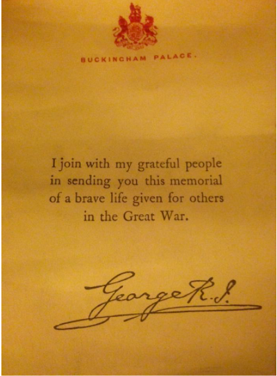 After the end of the war, Eliza had to deal with the administration of Harold’s medals, and requested that his Military Medal be sent to them by post. She also completed the necessary paperwork to receive a memorial plaque, hand-calligraphed scroll and King’s message (these were offered to the next of kin of soldiers who had died). All of these items were sent to Harry and Eliza Underwood at Craven Cottage, St Leonards. Sadly, I have no idea where Harold’s medals and plaque have ended up, but I have the scroll and King’s message in their original cardboard postal tube, which is one of my most treasured possessions.
