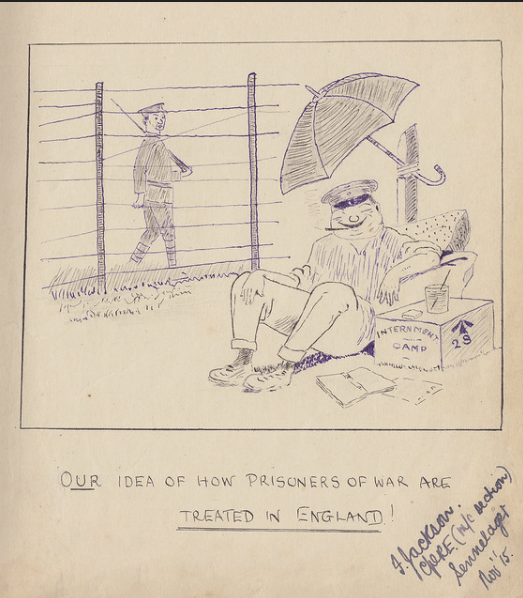 On 20 June he was transferred, for unknown reasons, to one of three camps at Sennelager (Senne I, II, or III), 100 km away. Sennelager was reputed to be the most brutal of Germany’s POW camps. One POW who spent time there wrote of the desperate condition of British wounded, and starvation of POWs. He said โSennelager has the most evil reputation among the German prison camps for systematic brutality and unprecedented ferocity.โ Another prisoner who absent-mindedly went too near the fence, had a bayonet stuck through his shoulder. However, all camps were subject to neutral inspections, so had to meet minimal standards. The Royal Hampshire Regiment Museum has a collection of 200 photos and drawings that belonged to a sergeant who had spent most of his three years as a POW at Sennelager (I’ve shared three of them below). Although most of the men photographed are officers, they look well fed and apparently were free to walk around the camp.