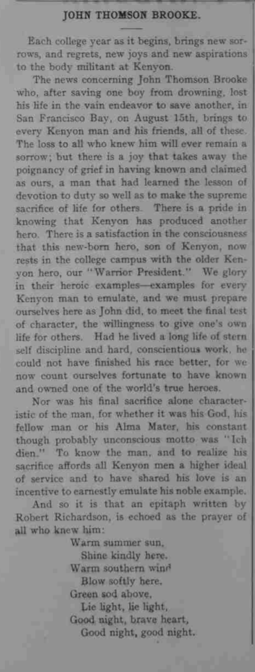 John Thomson Brooke had heart trouble, which makes his bravery even more poignant. As a youth, he had attended Kenyon Military Academy in Gambier, OH. He then attended Kenyon College, where he was a member of Alpha Delta Phi, and he had just graduated before moving to California. After his death, he was remembered fondly and with great pride in the Kenyon Collegian.