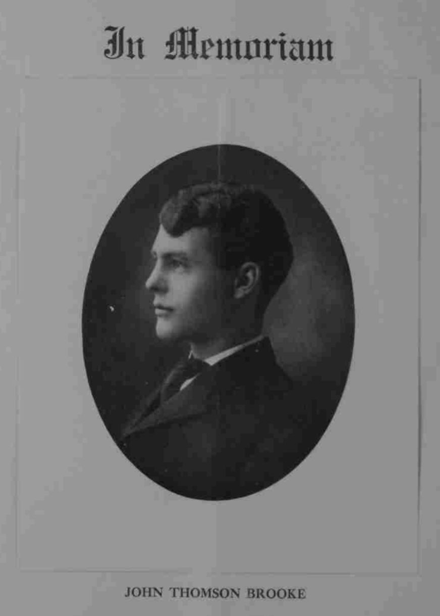 John’s grandfather, John Thomson Brooke I, was a professor at Kenyon, and his father Francis also attended the school. The three generations of Kenyon men are honored in the Brooke Memorial Windows in the Church of the Holy Spirit there, commissioned by John Thomson’s sister, Louisa Brooke Jones, and unveiled in 1931. John is remembered in a rose window, which “depicts a youth running along a rocky beach toward the setting sun.”