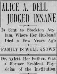 Worse was to come … In 1900, Charles was still in the Napa asylum. Alice was renting a home in Oakland with a daughter, Marguerite (b. 1895 — so presumably Charles was not her father), and poor Clarence and his brother were living in the Ladies Relief Society Children’s Home in the same city. In 1902, Charles Love Dell passed away, and then in 1904, Alice was herself committed to Stockton Insane Asylum! Newspaper articles state that Charles had also died at Stockton Asylum, where his widow was now a patient. Bizarrely, her father, Dr. W.D. Aylett, had been the superintendent of the asylum decades earlier (and I can’t resist mentioning that the resident physician he replaced had been dismissed after shooting his assistant physician in a duel!)