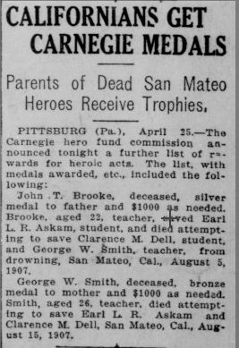 The following day, the San Francisco Call reported that Rev. Brewer had “telegraphed Smith’s mother and Brooke’s father regarding the catastrophe, but … does not expect to hear from them for a few days.” However, a funeral for Dell was held on the 17th, and he was buried in the Masonic cemetery at Colma.