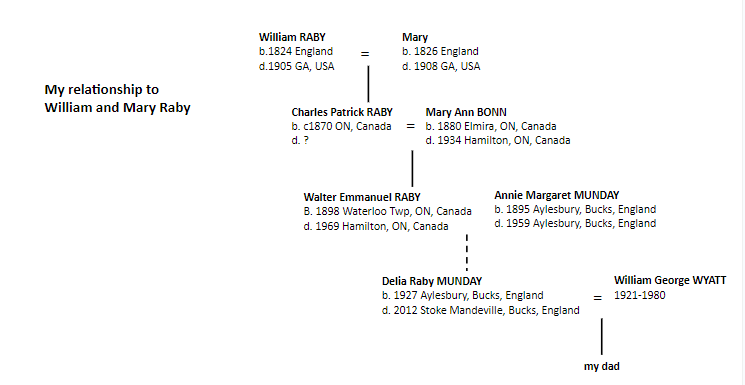 I’ll begin with a succinct description of the family tree that connects me to William and Mary Raby, my 3x great grandparents, who emigrated from England to Waterloo County in Ontario, Canada. Their youngest son, Charles Patrick Raby (1870-?), my 2x great grandfather, was born in Ontario. He married Mary Ann BONN, the daughter of first-generation German* immigrants, Herman Bonn and Juliana KAUFMAN. Charles and Mary Ann Raby had eight children, including Walter Emmanuel Raby (1898-1969), my great grandfather.