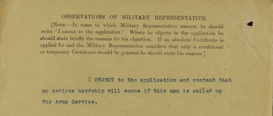 Five days later, a representative of the Military, having received a copy of William’s application, wrote to the tribunal to protest: “I OBJECT to the application and contend that no serious hardship will ensue if this man is called up for Army Service.”