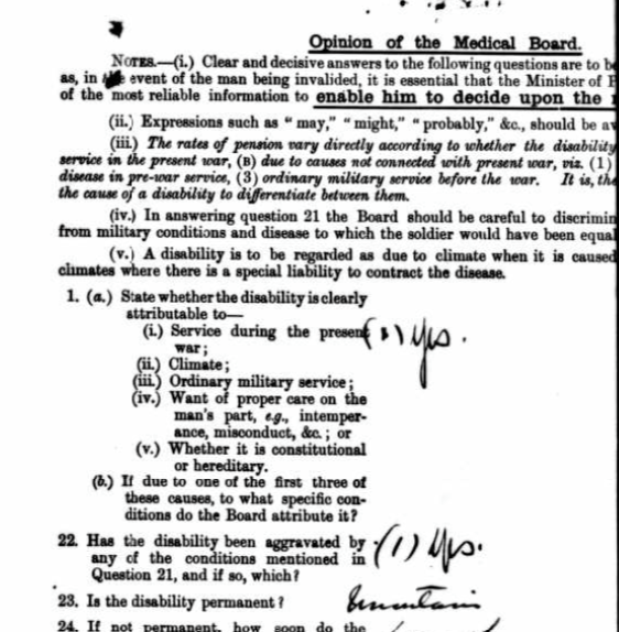 William underwent a thorough medical examination at Duke of York’s HQ in Chelsea on 22 October 1918. Although he was ‘a well developed man of good physique’, his degree of disablement was 30%. The medical officer in charge of his case wrote a detailed and very sympathetic account of William’s medical history since the start of his service in 1914, repeatedly stressing that he had carried out all his duties despite his illness. Critically, the opinion of the Medical Board was that this disability had been caused by service during this war.