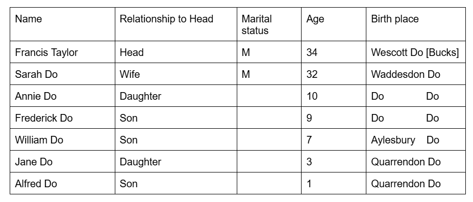 I located the family a decade earlier, in Aylesbury. This time, the family had six children, all with the surname Taylor. However, John, Ada and Clara (2nd, 4th and 5th children — shaded in the transcription below) matched the three children who’d been enumerated with the surname Homan in 1911. Another discrepency was Edith’s age. She had been 33 in 1911 but was said to be 27 in 1901. As I had observed in 1911, the older children’s ages meant it was unlikely that she was the mother of all of them.