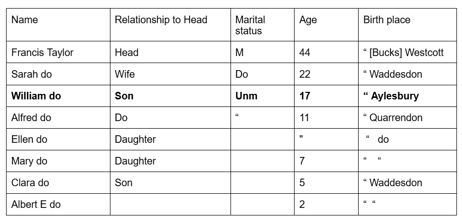 I was unable to find him in 1891 but in 1881 I found a close match in Waddesdon — William Taylor, age 17 (born about 1863). He was living with parents Francis and Sarah Taylor and five younger siblings. Was this my William?