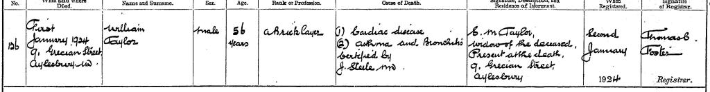 The 1921 census shows that William Taylor was still working as a bricklayer in his late 50s, and living with 7 of his children (in total, he had 14). He died at his home, 9 Grecian Street, Aylesbury, on New Year’s Day 1924, from cardiac disease, asthma and bronchitis. His lung problems were probably caused by his work, which had exposed him to brick dust and other chemicals for about 25 years. William’s ages were rarely consistent in official records (whether due to genuine confusion or evasion), and in typical style, his age at death was given as 56, though he was actually 60. The death certificate names him William Taylor.