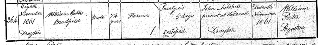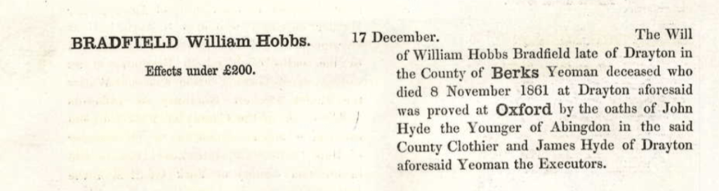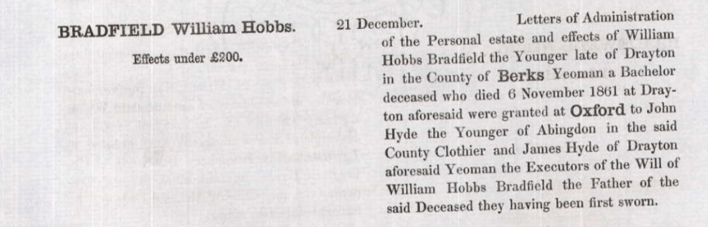 The deceased was William Hobbs Bradfield the younger, a yeoman of Drayton, Berkshire, who died intestate on 6 November 1861. From this brief information, I knew that there was also a William Hobbs Bradfield the elder, and that the younger of these namesakes had died first. Were they father and son, and what had happened to the younger man?