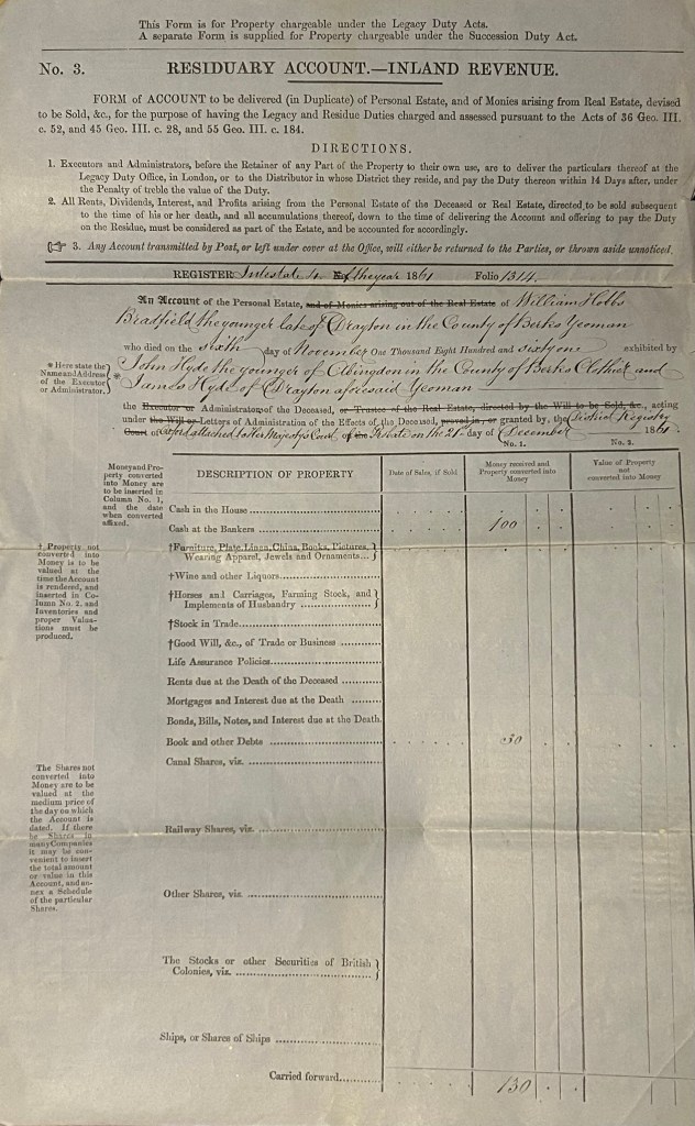 In a collection of old papers from the family who built my house, there’s a large blue document from 1861. It is a residuary account form, which was used to record any property of a deceased person that was chargeable under the Succession Duty Act. At first glance it didn’t look very exciting, and the family I’m researching are only named as executors. But on inspecting the sparse details, my interest was piqued …