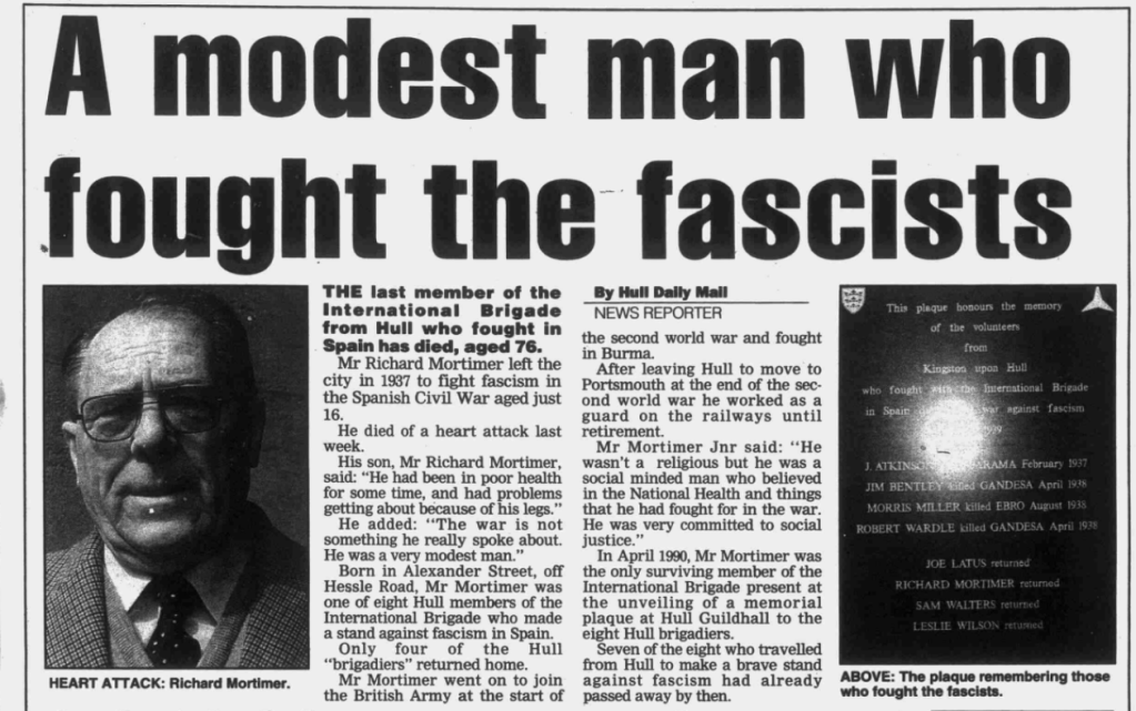 Richard John ‘Dick’ Mortimer was born in Hull on 17 September 1918, just a few weeks before the Armistice. His parents, John (known as ‘Jack’) and Alice, were Londoners (although Jack had Lancashire roots), but by the time of their marriage in 1916, they were based in Hull โ where Jack was serving in the Merchant Navy as a steward and cook on board fishing trawlers that had been requisitioned for mine sweeping. After the war, Jack continued to work as a trawler fisherman and cook, and the family became embedded in Hull’s fishing industry. Dick’s younger brother was a trawlerman, and his brother-in-law Harry Kirk (my husband’s grandpa) was a trawlerman. Before and after Dick’s volunteer service in Spain, he worked as a fish curer.