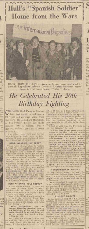 CROWDS flled Paragon Station hall last night to welcome a 20 years old corporal home from the wars. He is Richard Mortimer, a fish-worker before he made himself into a soldier. But a general couldn’t have had a better welcome. With other young Hull men he has been fighting in Spain with the International Brigade, now disbanded under the withdrawal of volunteers.