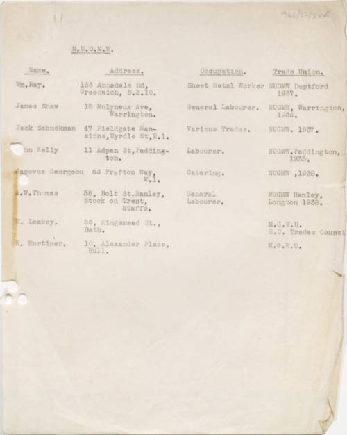 The University of Warwick also holds a large collection of primary sources for the Spanish Civil War, most of it from the archive of the British Trades Union Congress (TUC). Much has been digitised and is available online fo free via Warwick Digital Collections. By searching the collection, I found Richard Mortimer in two lists of IB members who had belonged to a trade union. The first list was sent in November 1938 to the Secretary of the Trades Union Congress by the Secretary of the International Brigade Dependents and Wounded Aid Committee, which had been awarded a TUC grant. The second (below) was produced in 1939. Both lists show that Dick was also a member of the MGWU – the Municipal and General Workers’ Union.