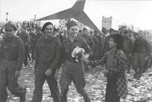 “As we marched through the streets, factory girls in blue overalls rushed out and smothered us in kisses and flowers. My face was covered in lipstick, and I had a bunch of flowers in each hand!”