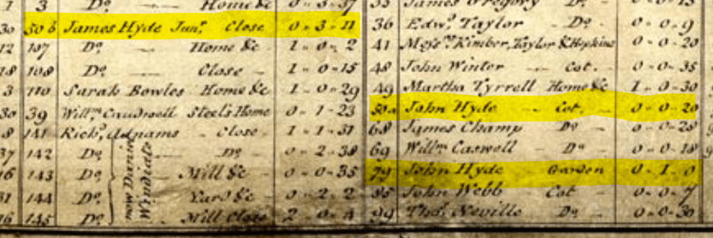 John’s property was close to land and buildings in the heart of the village that were owned by three other Hydes. The land behind the garden was rented by William Hyde, John’s younger brother, who lived in allotment 77. John’s cottage was within a close held by his nephew James Hyde Jnr, son of William, whose home was at 82. Both William and James farmed large areas of land throughout Drayton (most of it owned by New College). James Hyde Snr, another of John’s younger brothers, had allotments 81a and 81b and also a modest area of farmland.