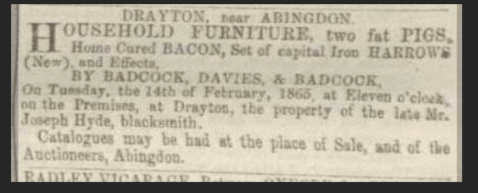 Joseph Hyde died intestate on 11 January 1865, and on 11 February, probate was granted to his next of kin, his half-brother John Hyde, blacksmith of Abingdon. The next day, a sale of Joseph’s goods to be held at his property was advertised in the Reading Mercury — including furniture, two fat pigs, home cured bacon, and a set of new iron harrows (a farming implement for tilling soil).