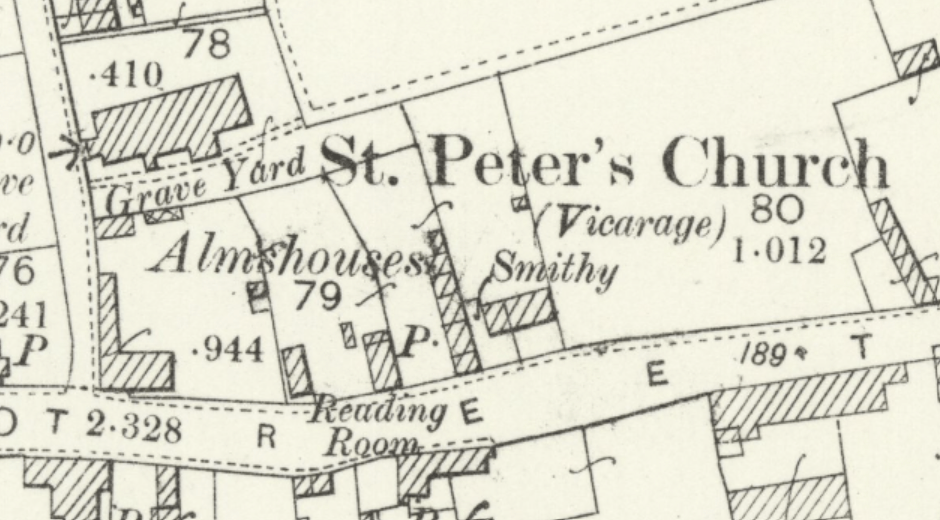 An OS map of 1897 shows the Smithy and Almshouses all within land parcel 79. A small outbuilding shown behind the Smithy has not survived to the present day. The map also shows that my house was once opposite a Reading Room! These were opened in villages and towns all over Britain in the Victorian period. As well as boosting literacy they provided an alternative, teetotal recreational space to pubs.