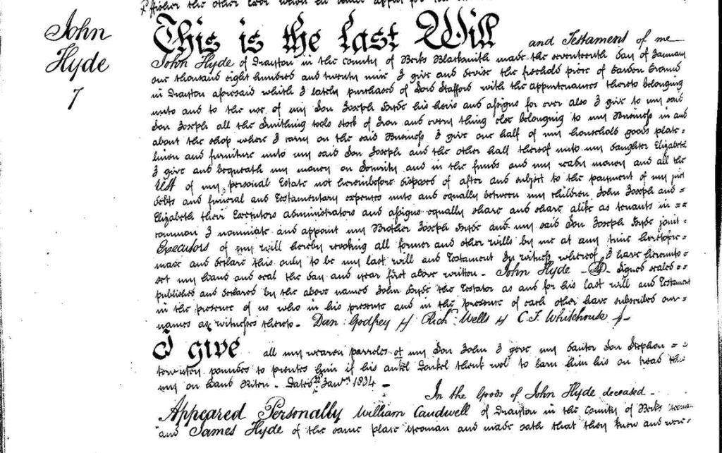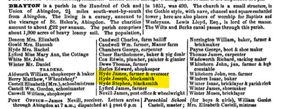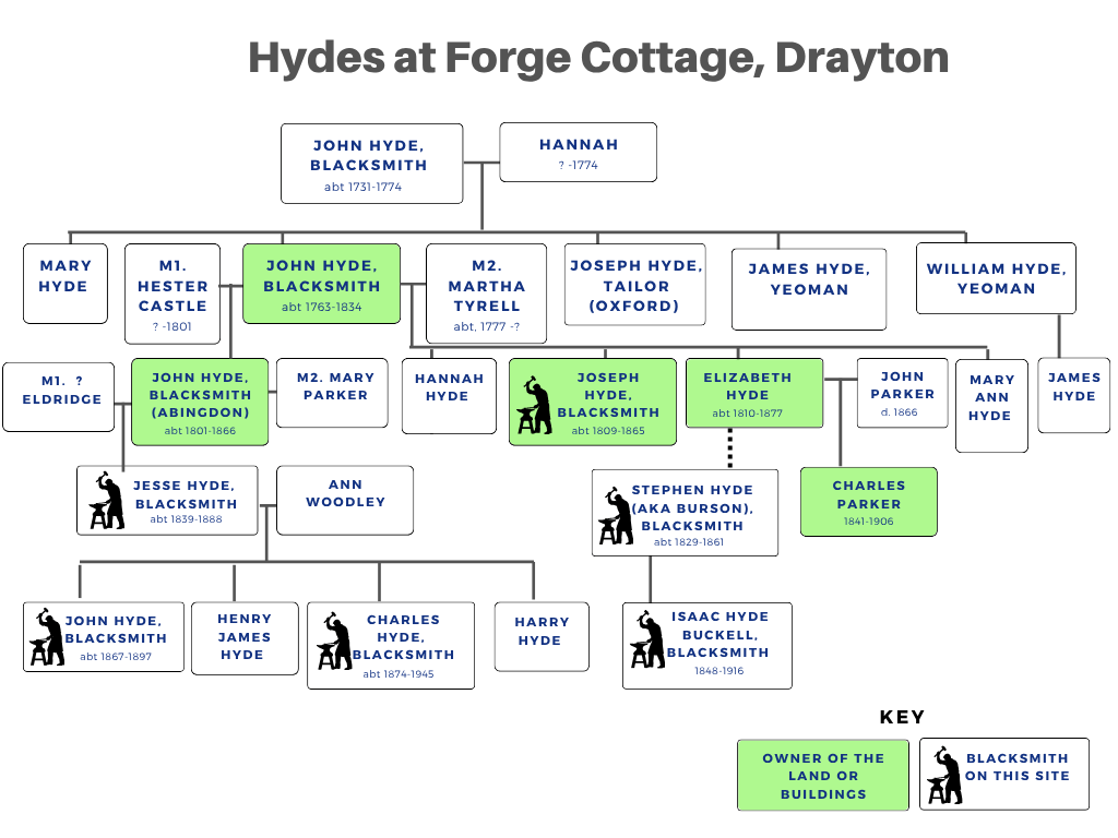 - Joseph died intestate and the property went to his brother John Hyde (blacksmith of Abingdon). John’s son Jesse then took over Drayton Smithy.