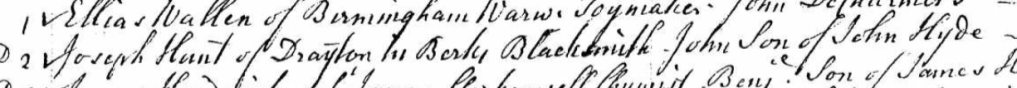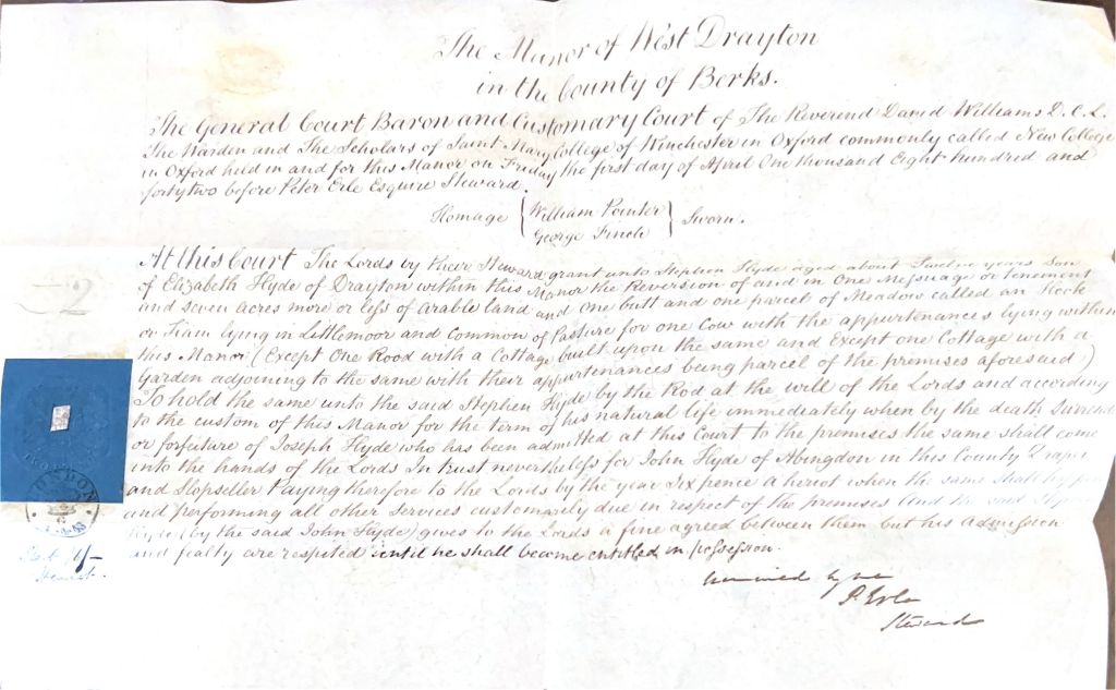 Although Joseph’s father John had left money for Stephen to be apprenticed to an ‘Uncle ?Darkwell’, he seems to have learned the blacksmith trade from his uncle Joseph. My collection of Hyde papers reveals that Stephen was also set to inherit a lifehold in Drayton from father and son John and Joseph Hyde — wealthy drapers in Abingdon (John’s son John, also a draper, became Mayor of Abingdon). John was probably a first cousin of John, the father of blacksmith Joseph — another example of more affluent Hydes helping their poorer cousins. On draper Joseph’s death Stephen would acquire ‘One Messuage or tenement and seven acres more or less of arable land and one butt and one parcel of Meadow called an Hock or Ham lying in Littlemoor and Common of Pasture for one Cow with the appurtenances lying within this Manor’ (except for two cottages).