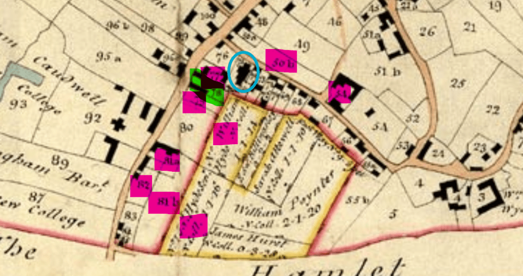 In particular, the location of Drayton’s almshouses, which are next door to Forge Cottage, has been a vital clue in my research. In the enclosure map of 1815, the almshouses are marked between John’s garden and William Hyde’s house, in allotment 78.