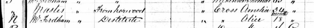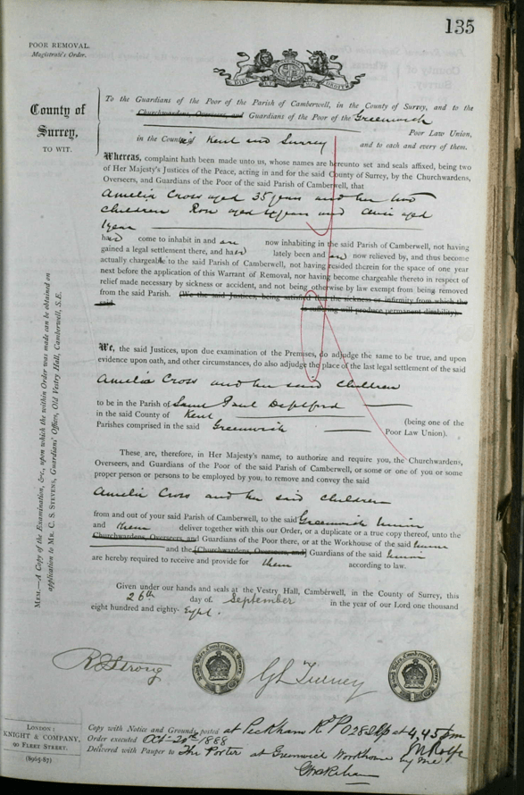 20 October 1888, Greenwich Union: admission to Woolwich Road Workhouse of Amelia CROSS, 35, Rose CROSS, 4, and Alice CROSS, 1. Amelia and her children had been removed from Camberwell, since they were not settled there. She was the โwife of Frederick a decoratorโ and they had been โdesertedโ.