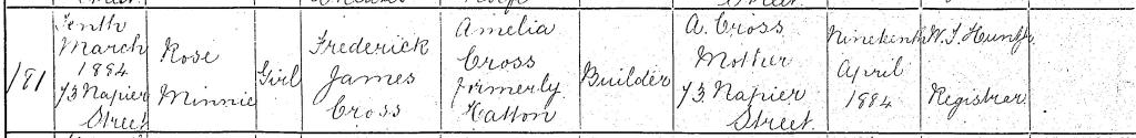 10 March 1884, 73 Napier Street, Greenwich district: birth of Rose Minnie CROSS; father is Frederick James CROSS, builder.