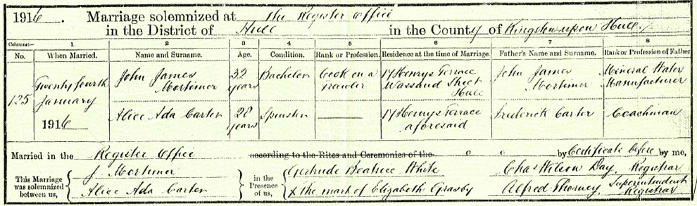 24 January 1916, Hull Registry Office: marriage of Alice Ada CARTER to John James MORTIMER; Alice’s father was Frederick William Carter, coachman.