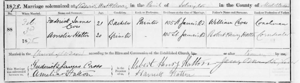3 Feb 1875, St David’s, Barnbury (Islington): marriage of Amelia HATTON, 20 and Frederick James CROSS, 21, a painter. Frederickโs father was William CROSS, a coachman.