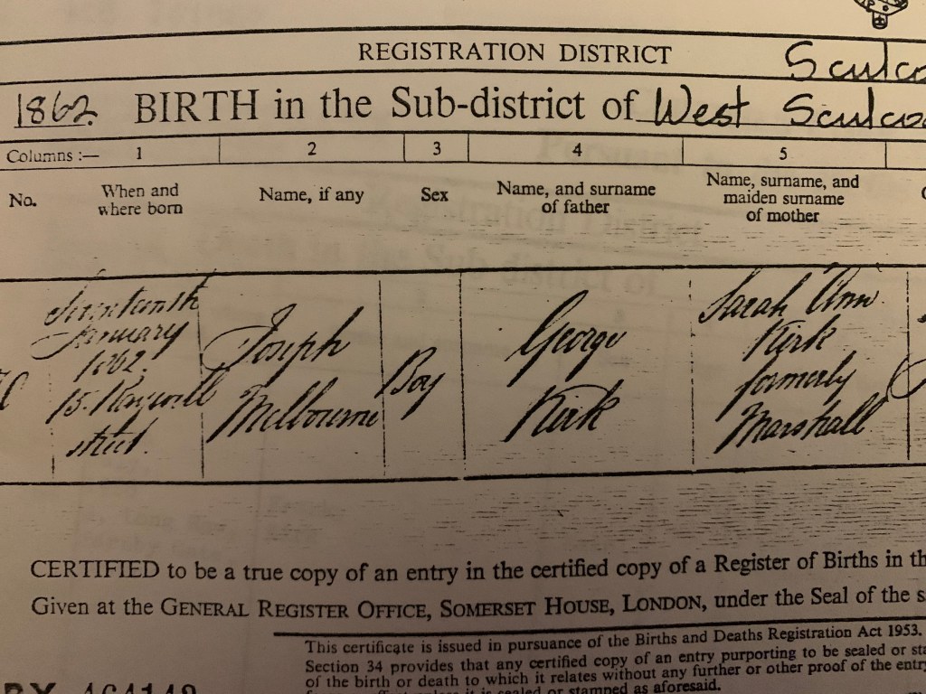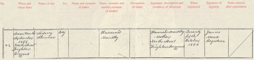The exact events that transpired after Sidneyโs birth in 1866 are hazy, but by 1868, Hannah and George seem to have been living together in London โ not only were banns read there, but around the same time that Martha Maultby was seeking financial compensation in the Secondaries’ Court, Hannah gave birth to a second child with George Skinner, in St Johnโs Wood, Westminster. Harry Maultby Skinner was born in Q2 1868. Hannah and George still werenโt married, but this time, their son received his fatherโs surname.