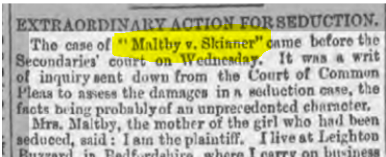 On 15 February, 1868, newspapers across the country reported that โa rather peculiar case was heard before Mr. Secondary Potter and a jury, on Wednesday. It was on a writ of enquiry sent down from the Court of Common Pleas to assess the damages in a seduction case, โMaltby v. Skinner.โโ (although my ancestors consistently spelled their name โMaultbyโ, some newspapers misspelt their name).