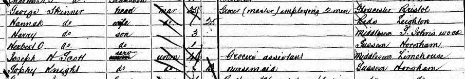 When Hannah walked down the aisle, she was possibly already pregnant with what would be her first legitimate child, Herbert Oxenham Skinner (b. Q4 1869), whose middle name came from Georgeโs mother. Herbert was born in Horsham, Suffolk, where the Skinner family โ George, Hannah, Harry and Herbert โ resided in 1871. The census shows that George was a master grocer employing two men.