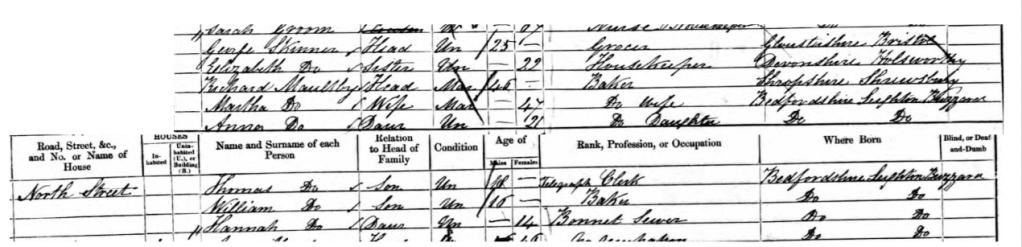 Hannahโs grandparents Thomas and Anna Maultby established their bakery on Friday Street, Leighton Buzzard before 1830 (having previously run a bakery in Shrewsbury), and the Maultbys were still on Friday Street in 1851. However, by 1861 they had moved to North Street, and Hannahโs two eldest siblings were also working in the family business.