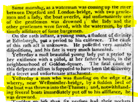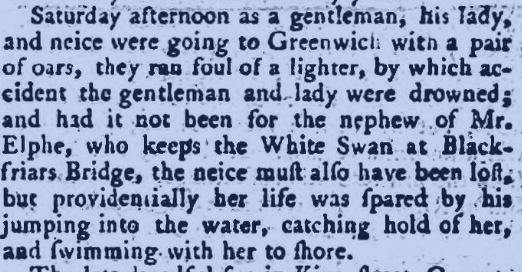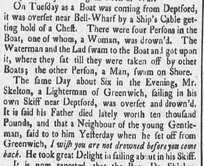 I’ve found several newspaper articles reporting drowning incidents in the Deptford area during this period. Although the victims in these cases are gentlemen and ladies enjoying travel and leisure, and not reflective of most of the drownings that seem to have occurred, they do show how dangerous the Thames could be for passengers in small vessels: