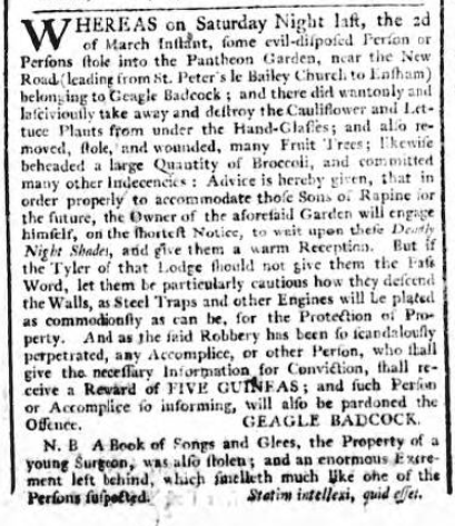 Geagle Badcock (c1724-1802) was the Cook of Pembroke College, Oxford for more than 50 years in the 1700s. I love his name, and imagine that even if he was an excellent chef, some cheeky scholar would have nicknamed him ‘Geagle Badcook‘. In 1776, when he was about 47, Geagle placed an extraordinary advertisement in Jackson’sContinue reading “Geagle Badcock Sniffs Out a Criminal”